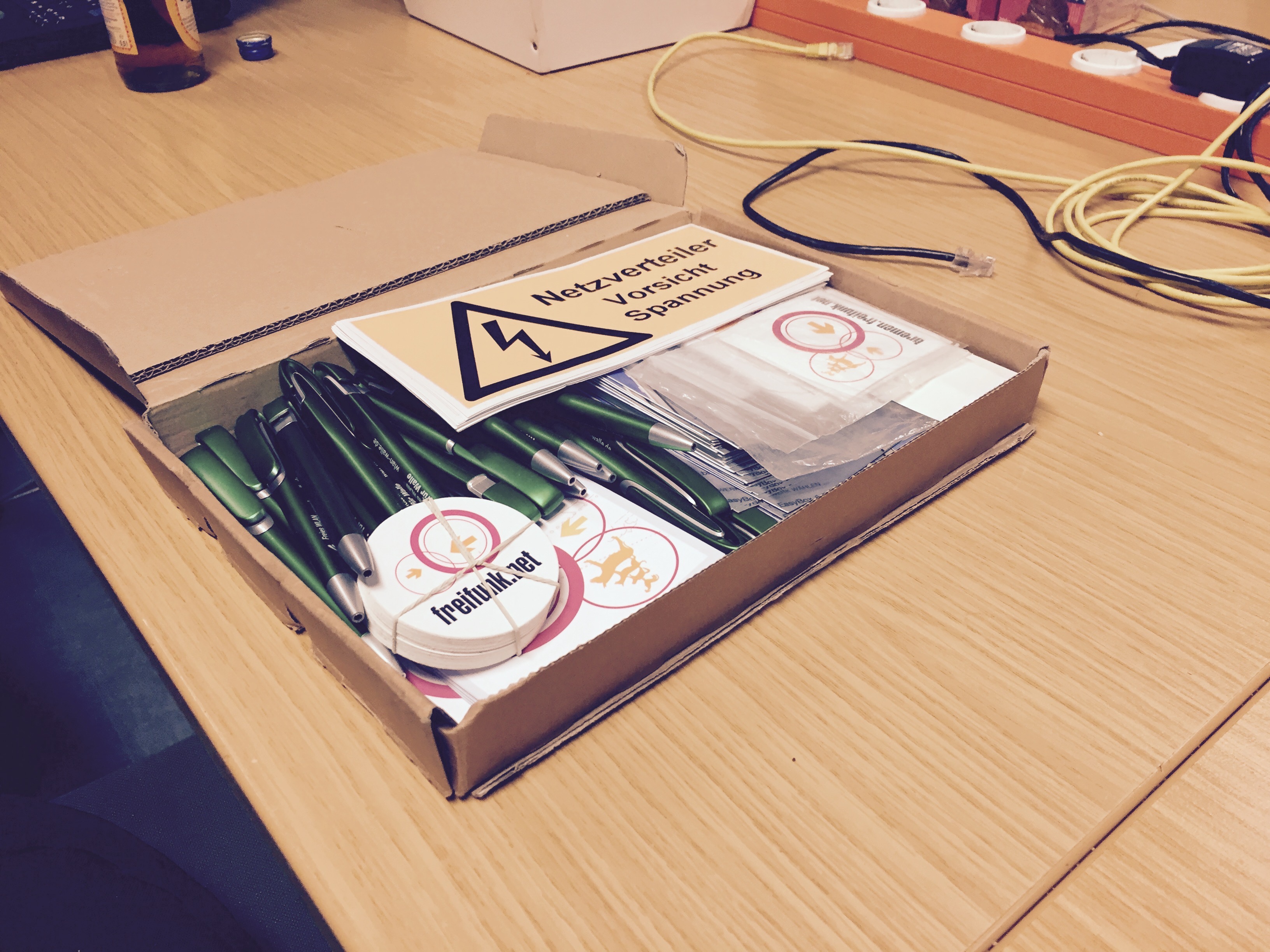 Die Artikel liegen im Hackerspace (Anfahrt) und können gerne zu Werbezwecken mitgenommen werden! Ob dieser geöffnet ist, siehst du in der Sidebar der Seite des Hackerspace.