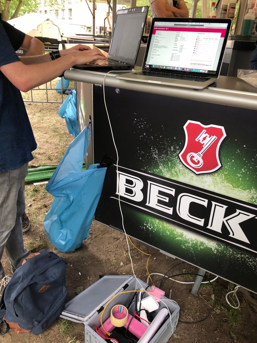 Am Nachmittag kamen weitere Freifunker dazu. Stehend wurde mit Laptops am Getränkewagen das Netz noch ein wenig per Software optimiert. Leider hilft selbst die beste Optimierung nicht viel, wenn die Bandbreite des Internetanschlusses begrenzt ist. Zusätzlich hat ein Stromausfall auf dem gesamten Gelände in der Nacht von Freitag auf Samstag ein paar kleinere Probleme verursacht.